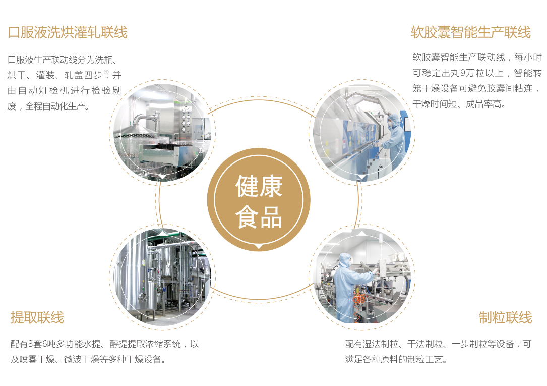 擁有多條健康食品智能生產(chǎn)聯(lián)線,可生產(chǎn)口服液、軟膠囊劑、硬膠囊劑、片劑、顆粒劑、粉劑等多種劑型產(chǎn)品。