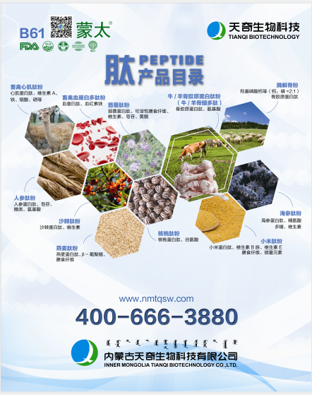 內(nèi)蒙古天奇生物科技有限公司,組建于2004年,為內(nèi)蒙古天奇蒙藥集團(tuán)核心子公司,坐落于美麗的草原明珠——赤峰市。公司依托獨特的地理位置與豐富的動植物資源,利用先進(jìn)的設(shè)備與工藝,堅持“骨肽,我們只做鮮的”產(chǎn)品定位,專注于各類肽原料的生產(chǎn),加工,定制,銷售。目前公司自主品牌蒙太®旗下已有畜源肽,植物肽等多個品類,十余種產(chǎn)品,在本次會議都將與大家見面。