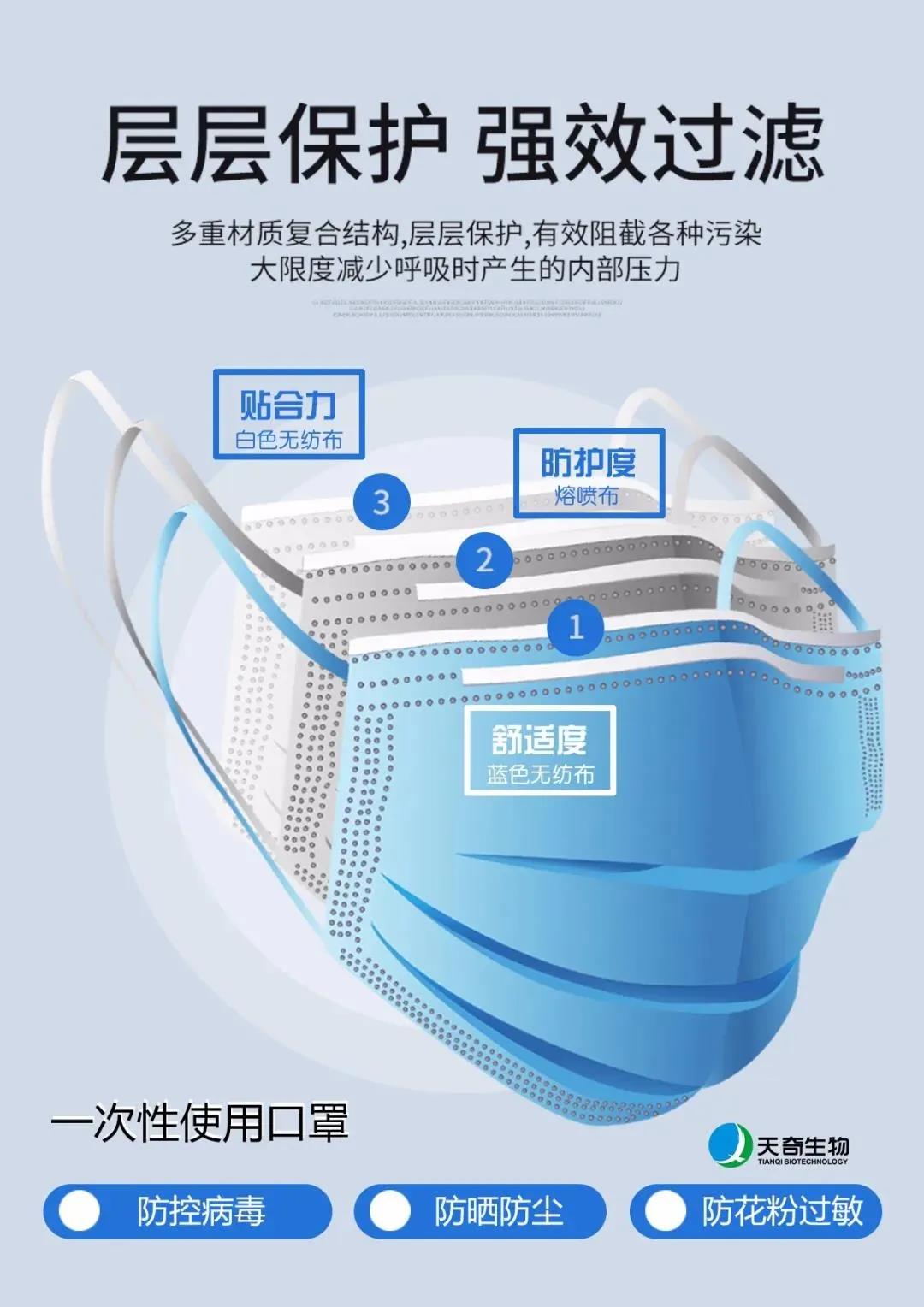 內(nèi)蒙古天奇生物科技有限公司可生產(chǎn)一次性使用口罩,口罩為三層防護(hù)結(jié)構(gòu),層層保護(hù)、強(qiáng)效過(guò)濾。最外層為藍(lán)色無(wú)紡布,能隔絕唾液等物質(zhì);中間層為熔噴布,是口罩最核心的材料;內(nèi)層為白色親水無(wú)紡布,能有效起到吸水不刺激皮膚的作用。在功能上還具有防曬、防塵、花粉過(guò)敏、紫外線傷膚的防護(hù)作用,同時(shí)佩戴舒適。