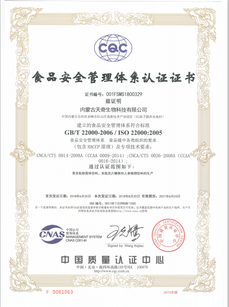 熱烈慶祝天奇生物天奇生物HACCP認(rèn)證、ISO22000體系認(rèn)證、FDA認(rèn)證復(fù)審成功。天奇生物作為集多肽食品原料、現(xiàn)代食品和保健食品研發(fā)、生產(chǎn)和銷售為一體的現(xiàn)代化企業(yè),對生產(chǎn)食品安全衛(wèi)生質(zhì)量控制、建立關(guān)鍵控制點對危害進(jìn)行控制,消除食品安全危害,確保食品在消費的生產(chǎn)、加工、制造、準(zhǔn)備和食用等過程中的安全等方面一直不懈努力并獲得中國質(zhì)量認(rèn)證中心的全面肯定。不僅致力于國內(nèi)大健康產(chǎn)業(yè)的拓展和銷售,同時積極開拓海外市場獲得FDA認(rèn)證,這也標(biāo)志著天奇生物相關(guān)產(chǎn)品被相關(guān)部門認(rèn)定,確保食品供應(yīng)安全、干凈、新鮮并且標(biāo)識清楚。注:(天奇生物自成立不久便獲得相關(guān)資質(zhì)認(rèn)證,此次為復(fù)審。)