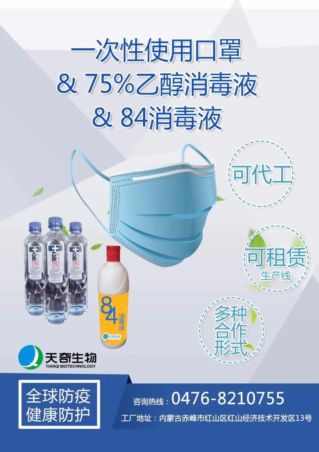 內(nèi)蒙古天奇生物科技有限公司積極響應(yīng)國(guó)家號(hào)召,有效防控外來(lái)病毒傳播,特建立十萬(wàn)級(jí)消殺用品車間,除口罩外,還可生產(chǎn)75%乙醇(酒精)消毒液、84消毒液。并可多種形式合作,可代工,可租賃生產(chǎn)線。